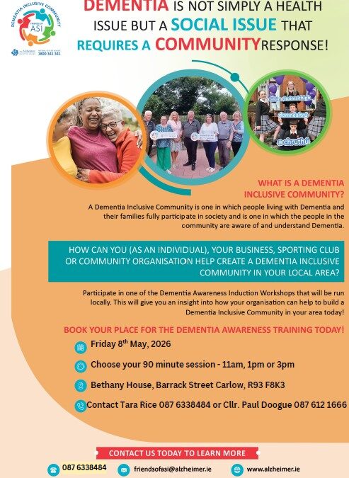 Participate in one of the Dementia Awareness Induction Workshops that will be run locally. This will give you an insight into how your organisation can help to build a Dementia Inclusive Community in your area today!