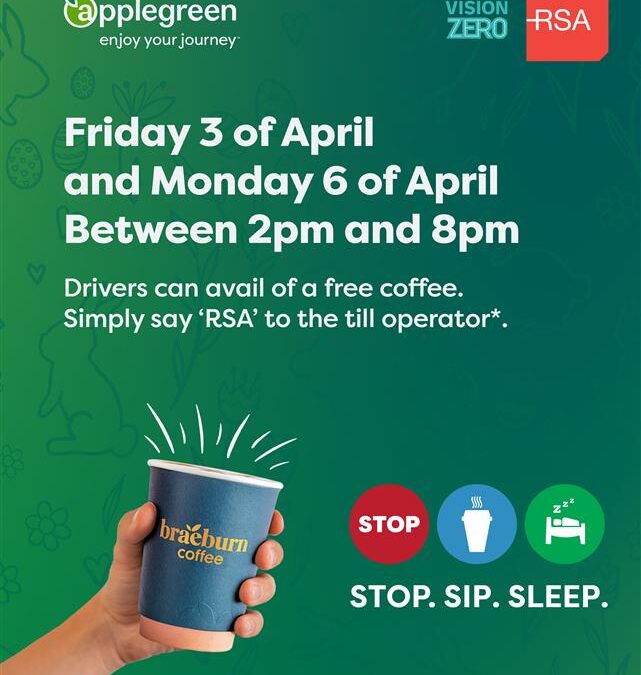 If you feel tired, don’t push on. Take a break and call into Applegreen and pick up a free coffee.