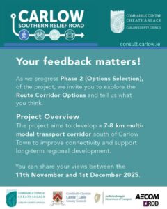 Carlow County Council, in partnership with Laois County Council and the Department of Transport (DoT), invite those who live in, work in or travel through the study area along the southern edge of Carlow Town and other interested parties to participate in the second non-statutory public consultation for the Carlow Southern Relief Road (CSRR).